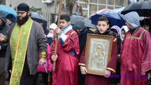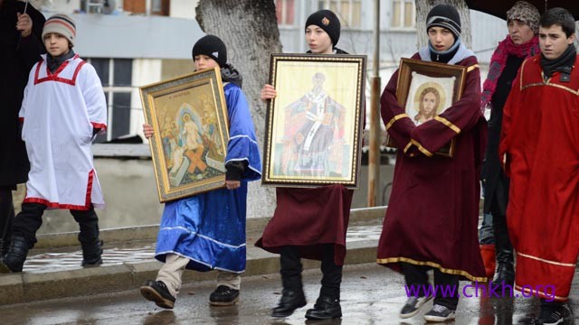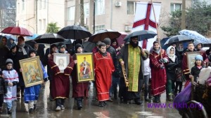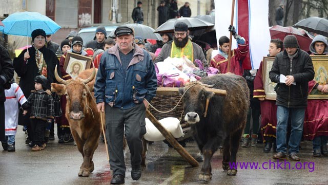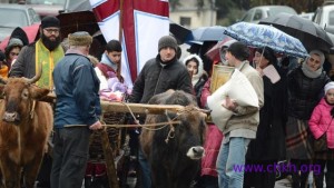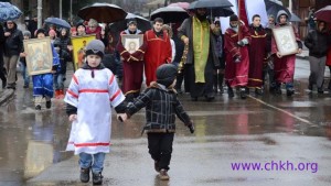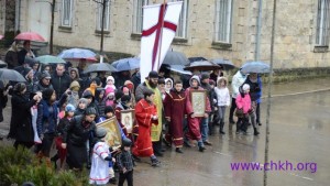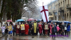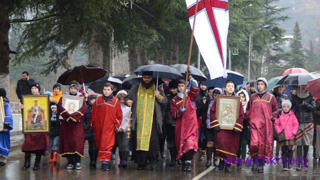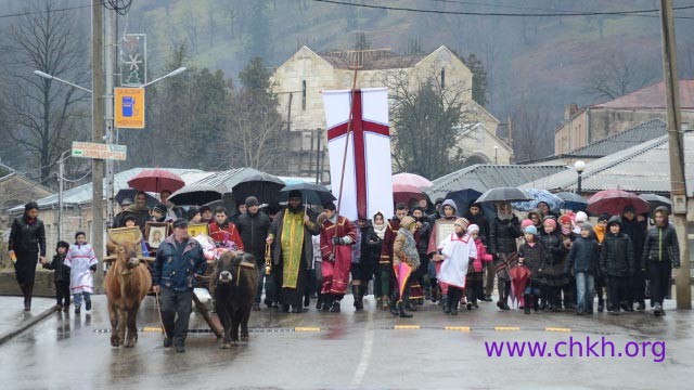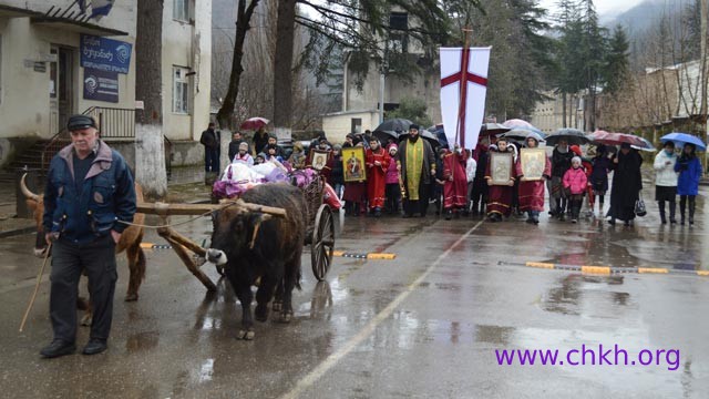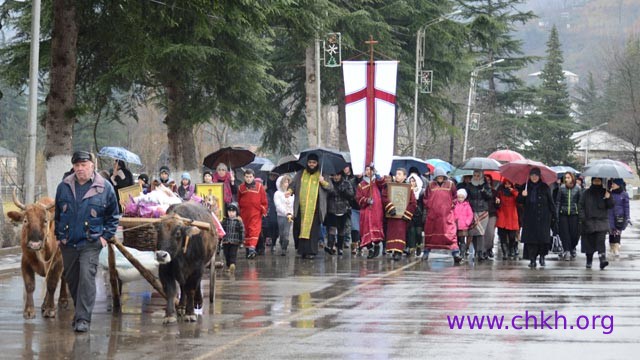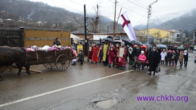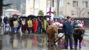 შობის დღესასწაულის მახარობლებმა ხარაგაულის ცენტრალური ქუჩა საეკლესიო დროშებით, საჩუქრებით დატვირთული ურმითა და გალობით ჩაიარეს.