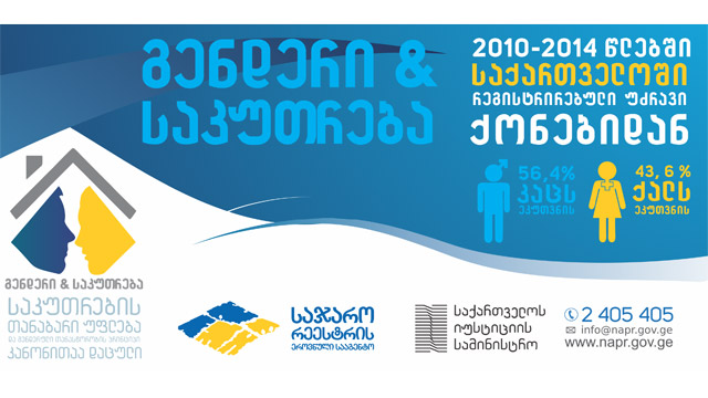 მათგან 743888 კაცია (56.4%) და 575267 – ქალი (43.6%). ქალები საკუთრების უფლების რეგისტრაციის რაოდენობით თითქმის ყველა რეგიონში ჩამორჩებიან კაცებს, ზოგიერთ მუნიციპალიტეტში კი ეს მაჩვენებელი მინიმალურია (მაგალითად, დმანისში, ბოლნისში, მარნეულში, ხულოში, ლენტეხში, შუახევში, წალკაში, მესტიაში, გურჯაანსა და ყვარელში).