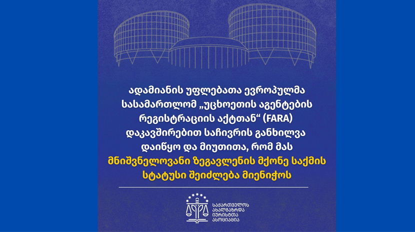 საქართველოს ახალგაზრდა იურისტთა ასოციაციის (საია) ინფორმაციით, ადამიანის უფლებათა ევროპულმა სასამართლომ „უცხოეთის აგენტების რეგისტრაციის აქტთან“ (FARA) დაკავშირებით საჩივრის განხილვა დაიწყო.