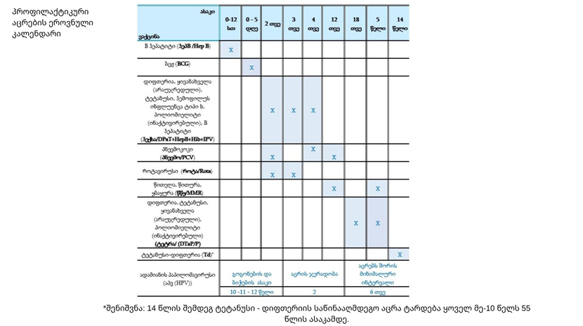პირველი იმუნიზაცია ტარდება სამშობიაროშივე „ბე“ ჰეპატიტისა და ბცჟ ვაქცინით. სხვა აცრები ტარდება იმუნიზაციის გეგმის მიხედვით 2 თვის ასაკიდან, პროფილაქტიკური აცრების ეროვნული კალენდრის მიხედვით, რომელიც ასე გამოიყურება.